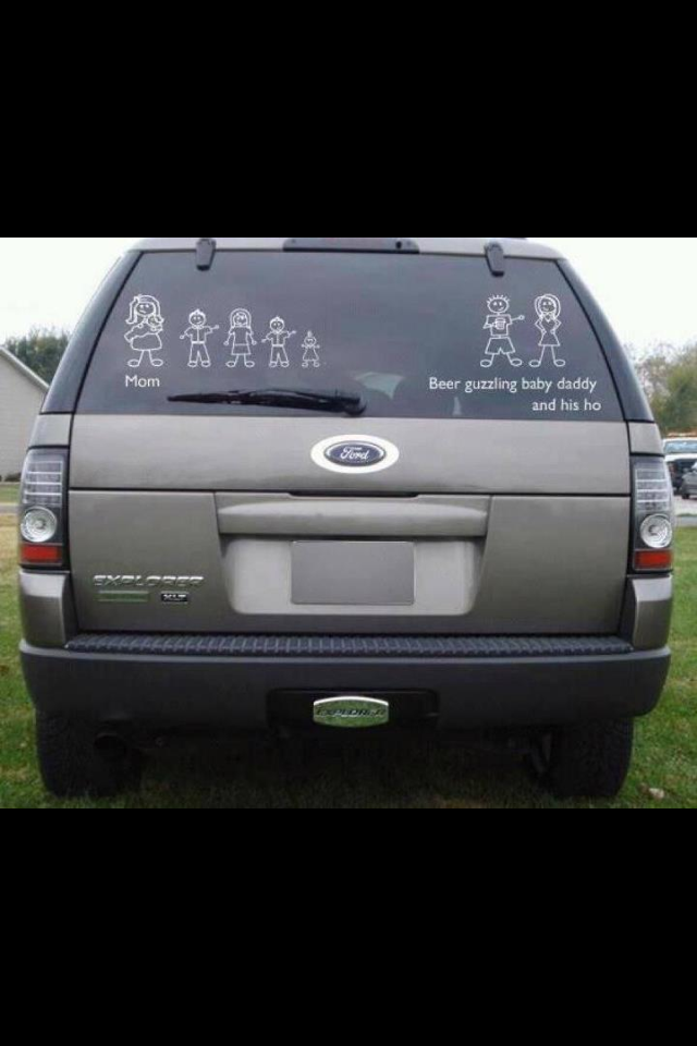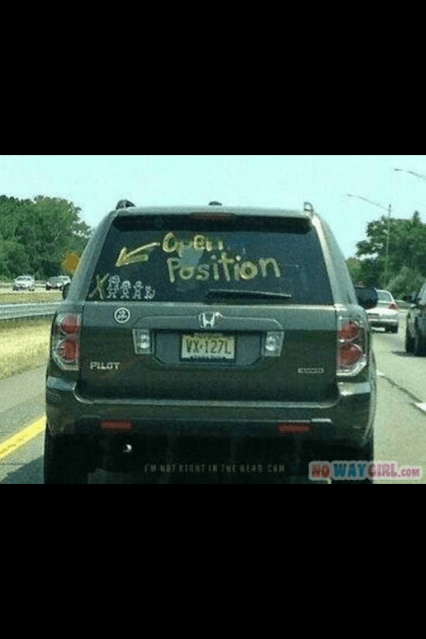 I saw this online yesterday. Nothing like putting oneself out there, right? And mom appears to be doing just that. With this SUV, one gets a mom, a daughter, a son, and either a cat or a dog. (The photo isn’t quite clear enough for me to the able to tell which four-legged family pet.) Great. And I get the distinct impression that mom is needy, clinging, and doesn’t think she can function without a man. (Yeah, I’m getting all of that from the window decal and shoe-polish addendum. This blog is called JUDGED by Jenn, is it not? So yeah, maybe I’m “judging” a little bit. Go figure.) This is a great lesson for the kids, and in my paranoid, former deputy prosecutor mind, as good as an engraved invitation to predators.