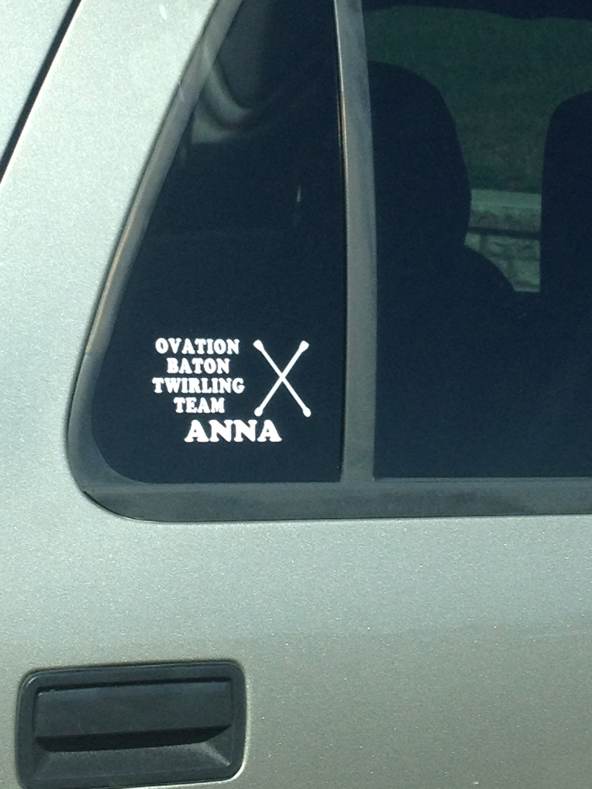 Here is an example of what I’m talking about. I snapped this outside one of the courthouses I visit regularly. It caught my eye because of the crossed batons. While I am thrilled that this competitive baton twirling team exists, Anna’s mom might as well have printed the entire performance schedule on the back glass, because in this day and age, that sort of information would not be too difficult to obtain. (Note: No, I didn’t try.)