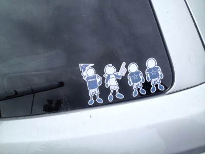 Swell. Now we know your vehicle may contain mom, dad, and two sons, all of whom are Dallas Cowboys fans. Spectacular. Hard to get that from traditional stick figures, though, so they’ve plumped up the drawings a little bit and added color and “fan gear”. (Note: I’m not a Cowboys fan; this just caught my eye in the grocery store parking lot last week.)